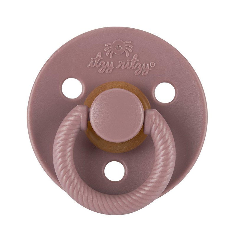 ¡Conoce el chupete de goma natural Itzy Soother! Cada tetina de caucho natural tiene forma de cereza para imitar la lactancia y está acentuada con un asa de cable. Cada juego incluye 2 colores complementarios mientras cumple con las normas de seguridad de ASTM y no contiene BPA.