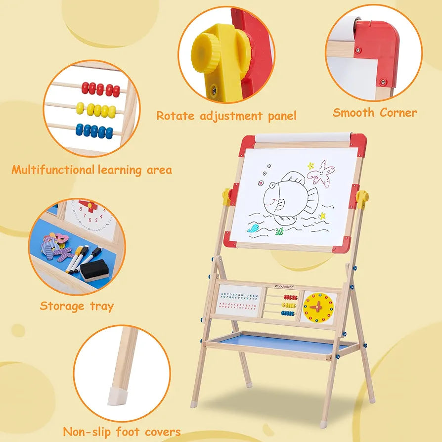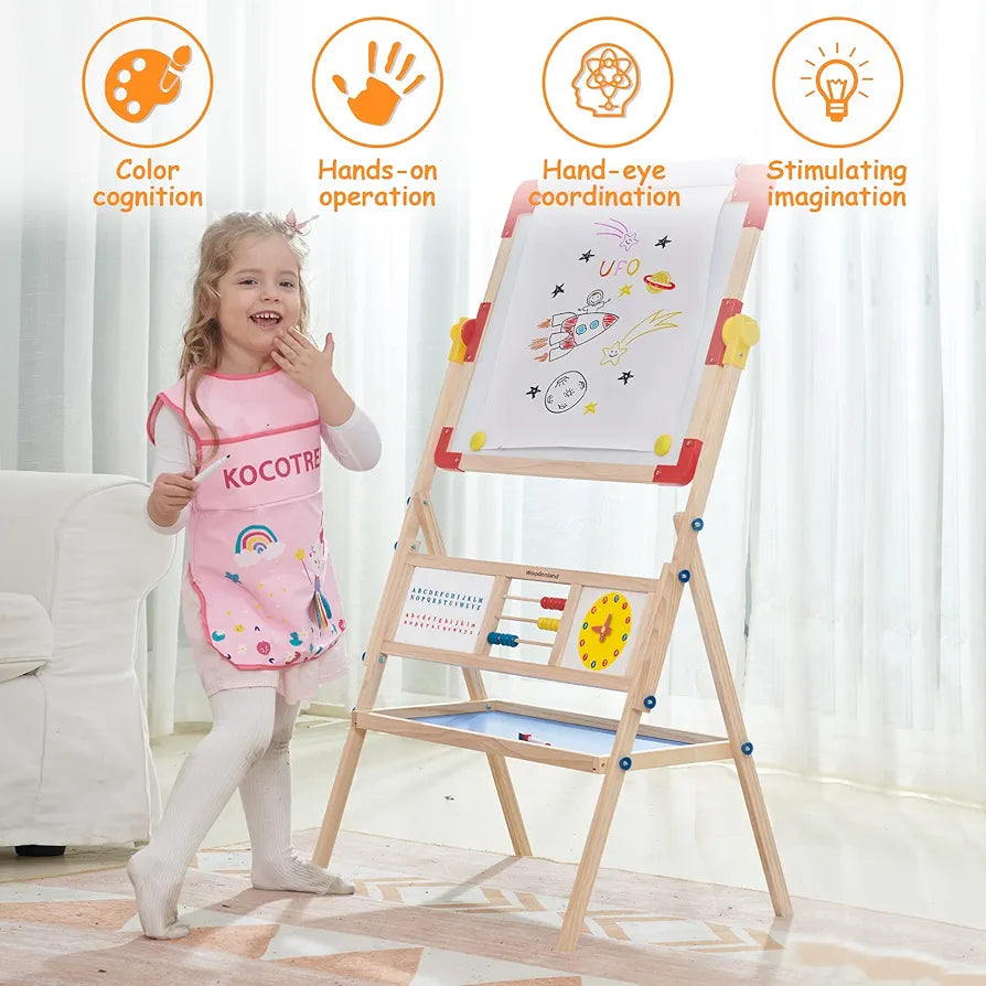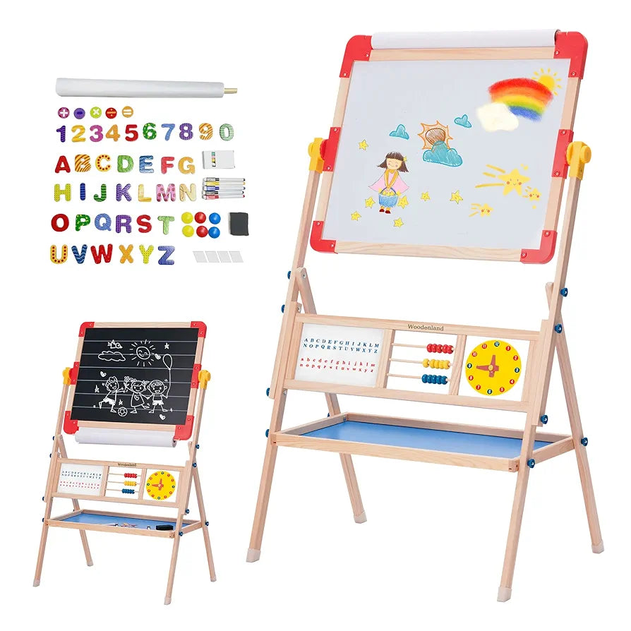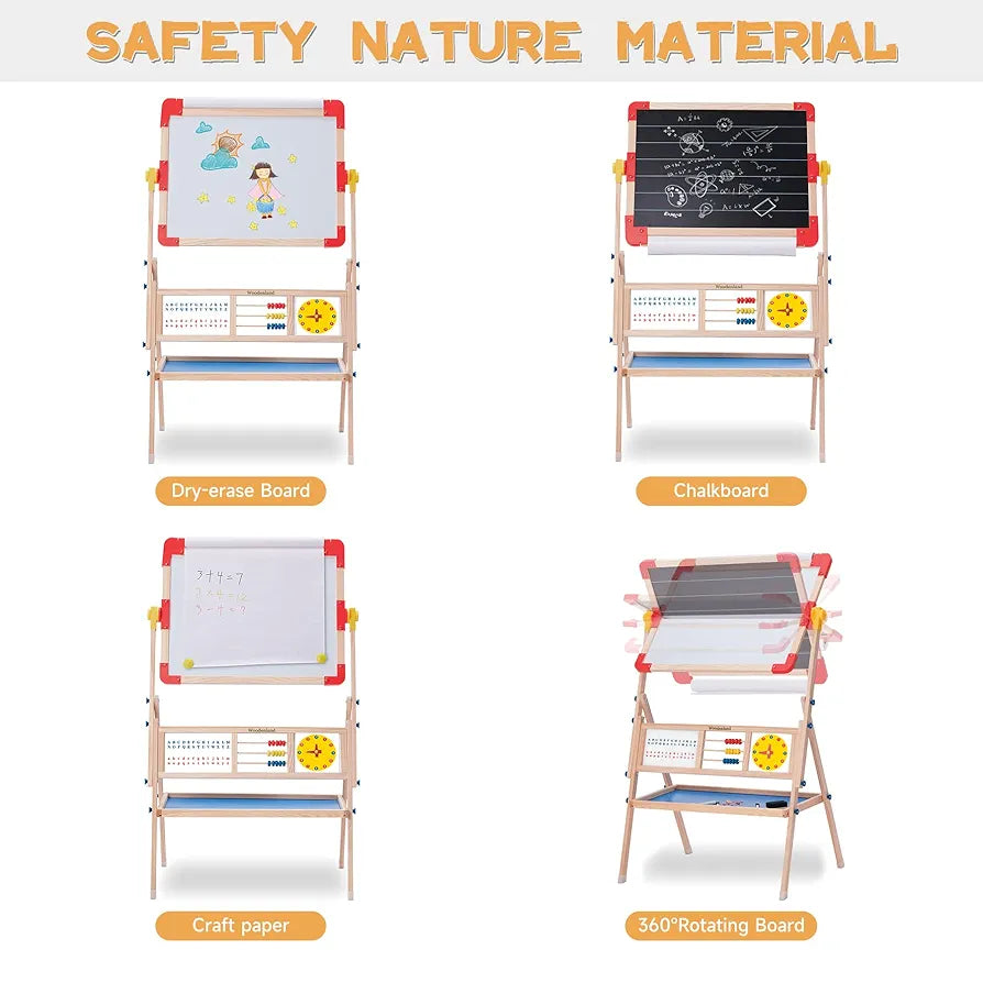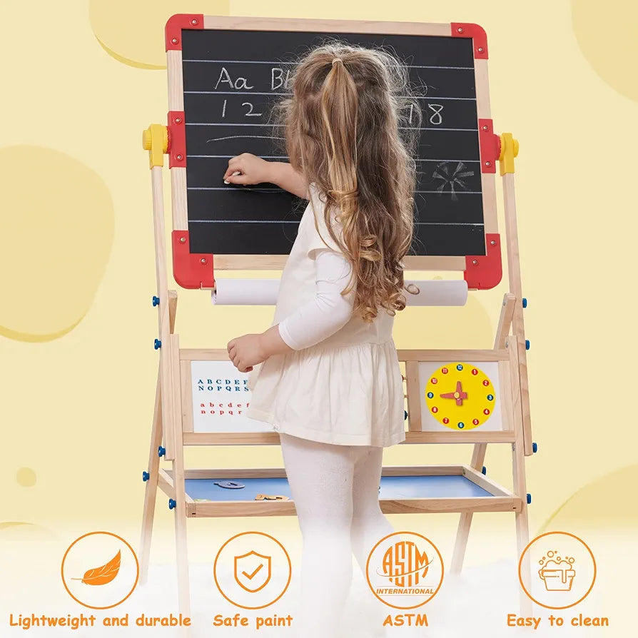 Caballete de madera todo en 1: nuestro caballete de madera todo en 1 ofrece tres formas diferentes para que los niños expresen su creatividad. El tablero de doble cara proporciona un amplio espacio para dibujar o usar imanes, mientras que la opción de papel de dibujar permite a los niños explorar sus habilidades artísticas. Además, la gran mesa de dibujo fomenta el juego social, por lo que es una experiencia divertida para que muchos niños disfruten juntos.