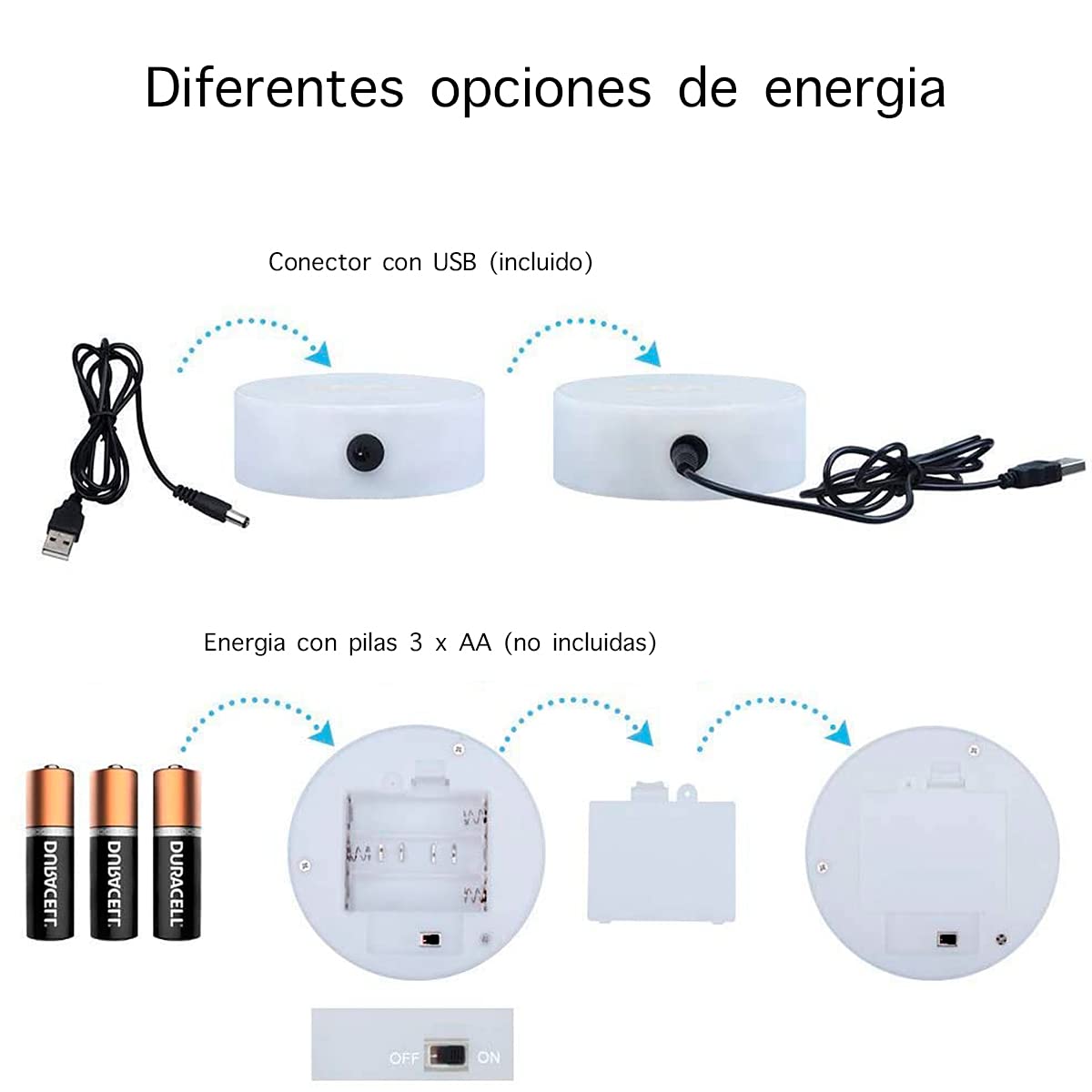 La base está fabricada en plástico rígido de color blanco, en la parte de abajo encontraremos la tapara donde podremos colocar 3 baterías "AA" no incluidas para poder utilizarla sin el cable.