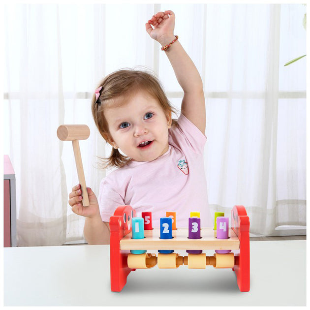 El juguete consta de un banco de madera, 8 clavijas de colores y un martillo de madera, lo que no solo garantiza la seguridad durante el juego, sino que también garantiza su durabilidad y resistencia.