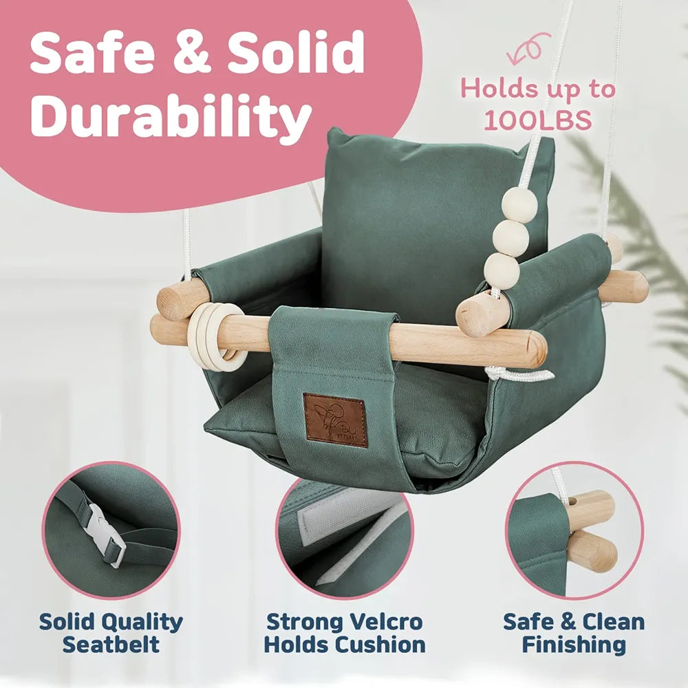 🛡️SEGURO Y DURADERO - Nuestro columpio está fabricado con piezas que han superado la prueba del ácido, garantizando la seguridad de tu bebé. El resistente cinturón de seguridad y el cojín de respaldo con velcro mantienen a tu pequeño seguro y cómodo.