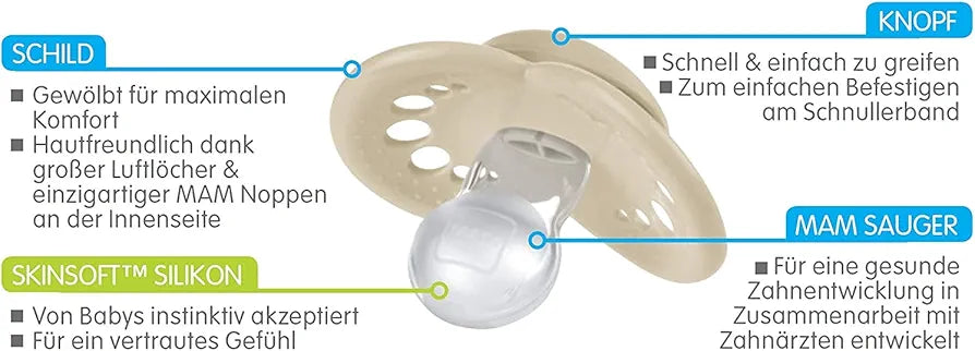 - Especialmente suave: el MAM Original Elements con tetina de silicona SkinSoft se siente muy familiarizado en la boca, por lo que se acepta instintivamente. Un enriquecimiento para cualquier equipamiento de bebé