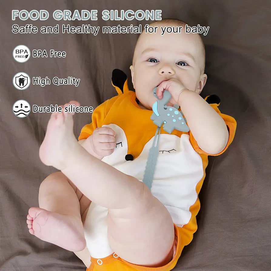 • Diseño de una sola pieza: los juguetes mordedores de silicona para bebés seguros, elegantes y multifuncionales cuentan con un clip de chupete de diseño de una sola pieza y un colorido diseño de dinosaurio. No hay necesidad de preocuparse por que se caiga, y no hay riesgo de asfixia. Ayuda a la dentición del bebé a aliviar el dolor de la dentición