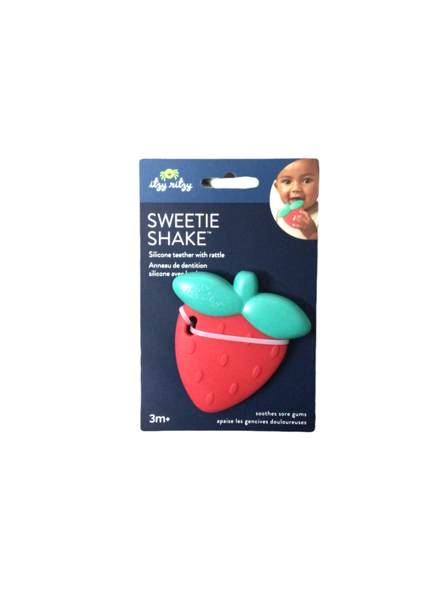 ¡Agita, traquetea y diente! Sacude esa tristeza de la dentición con el mordedor de silicona Sweetie Rattle™. Hecho de silicona suave y flexible, este sonajero atractivo presenta múltiples texturas para calmar las encías doloridas junto con sonidos suaves de traqueteo para enseñar causa y efecto.